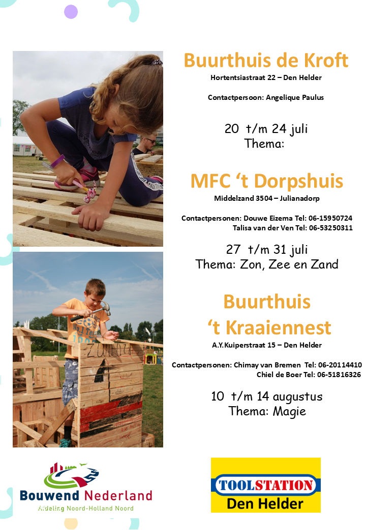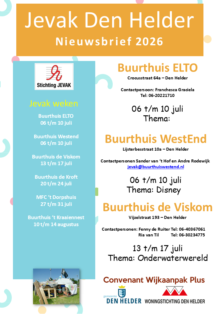Op maandag 06 juli 2026 gaat de Jevak Den Helder van start bij Buurthuis ELTO en Buurthuis WestEnd Volgen De Jevak 2026 wordt mede mogelijk gemaakt door: